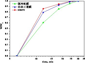 目前高端的全热交换膜技术为美国和日本等国外的几家公司垄断,我国热交换机芯使用的全热交换膜普遍存在透湿性能不佳、对二氧化碳和甲醛等有害气体无有效阻隔性能等一系列问题。高分子事业部薛立新研究员领导的功能膜团队针对上述问题,研究不同材料全热交换膜对传热透湿(传质)性能及对有害气体阻隔性能的影响,形成两个系列的功能添加剂:Z系列功能添加剂(可在保证透湿性能前提下,有效降低CO2等有害气体透过率);W系列功能添加剂(可同时增大全热交换膜的透湿量和透湿速率)。在次基础上成功开发出一系列高效低成本全热交换膜。自行研制全热交换膜NIMTE系列的水蒸气透过率均可达到2600~3000 g/m2/day以上,远高于国内外相关产品;二氧化碳透过率则仅为国外先进产品约1/6~1/7,详细数据如表1所示;水蒸气透过速率亦高于国内外商业膜,如图2所示。目前,本课题组研制的全热交换膜,已进入连续化生产中试放大阶段。