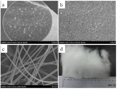 (a)莫来石纤维断口;(b)莫来石纤维壁;(c)莫来石纤维表面;(d)莫来石纤维散棉实物照片