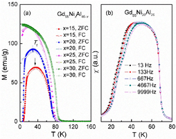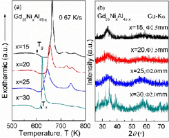 GdNiAl非晶随Ni/Al变化的DSC曲线及XRD GdNiAl非晶的热磁曲线及交流磁化率随频率的变化曲线
