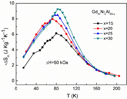 中科院宁波材料技术与工程研究所沈宝龙研究员和杜娟研究员在块体非晶的形成能力和磁热效应方面开展了研究工作。其中早期的研究工作表明,在具有大的磁晶各向异性的Tb基块体非晶中发现了自旋玻璃行为,并且在自旋玻璃转变温度以上获得了大的磁熵变[J. Magn. Magn. Mater. 321 (5), 413];而各向异性较小的一定成分的Gd基非晶一般具有铁磁性,并且在居里温度附近同时具有大的磁熵变值和高的制冷效率RCP[J. Appl. Phys. 103 (2), 023918]。在近期的研究中,对Gd55NixAl45-x(x=30,25,20,15)非晶的Ni、Al成分配比对其磁性的影响的研究表明,随Ni/Al比值的降低,体系从铁磁性行为逐渐转变为自旋玻璃行为。此外我们在铁磁性自旋玻璃温度附近也获得优异的磁制冷性能:在5T磁场下,磁熵变为ΔSmMax 9.25 J kg-1K-1,绝热温变为4.3K,冷冻效率RCP为851 J kg-1。该工作发表在近期的Appl.Phys.Lett.101, 032405 (2012)。该工作为深入研究自旋玻璃的起源,特别是在所含元素都具有较小的磁晶各向异性或不具有磁晶各向异性的非晶体系中出现的自旋玻璃行为的研究提供了一个极好的样本,同时也为研究非晶合金磁致冷性能及其在低温区的应用起到了良好的推动作用。