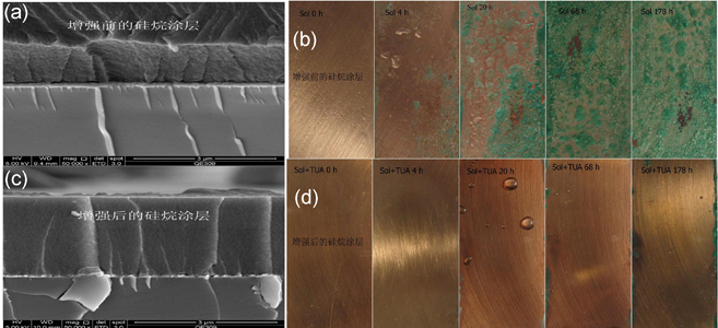 铜在TUA增强前后硅烷涂层的截面形貌及抗腐蚀性能对比