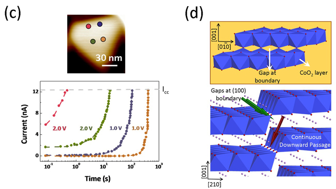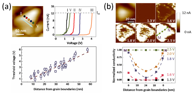 (b) 纳米尺度下使用C-AFM 测试的电场作用下LixCoO2薄膜导电性能的变化
