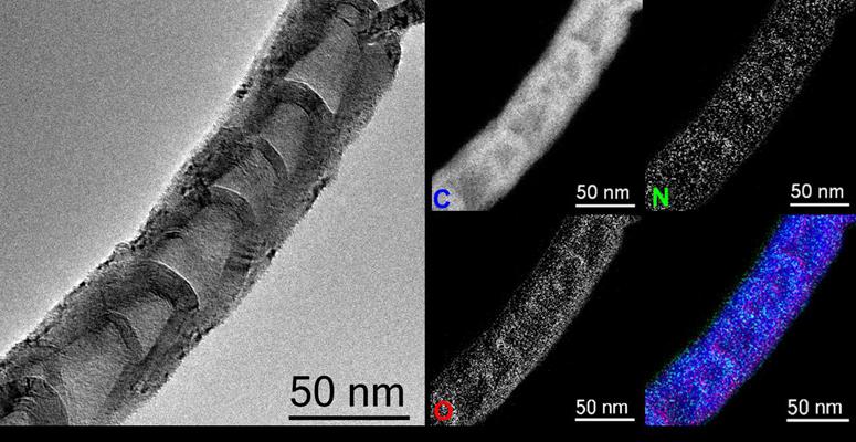 图1:氮掺杂纳米碳管透射电镜照片与化学元素分布