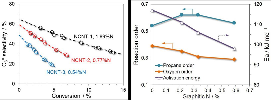 在前期非金属催化研究的基础上,中科院宁波工业技术研究院(筹)新能源技术所张建研究员课题组与中科院金属研究所苏党生研究员、华南理工大学彭峰教授等合作开展了系统的研究工作,通过化学气相沉积方法制备了氮含量可控的多壁纳米碳管(图1),将其作为丙烷氧化脱氢催化剂时发现,随着体系中氮含量的增加,目标产物丙烯的选择性和生成速率均有显著提升。进一步通过化学反应动力学与表面分析证明,石墨氮物种可以降低氧分子反应级数和反应活化能,是氧分子活化与催化性能提升的关键因素(图2)。该成果为纳米碳掺杂体系反应机理与结构设计提供了新现象、新思路。