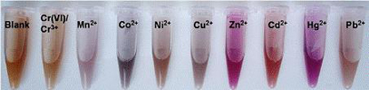 多种离子检测方面:利用十六烷基三甲基溴化铵(CTAB)和溶于碱溶液的双硫腙修饰金纳米粒子(AuNPs),发展出一种特异性功能化AuNPs试剂,该试剂对10种重金属离子(Cr(VI)、 Cr3+、Mn2+、Co2+、 Ni2+、Cu2+、Zn2+、Cd2+、Hg2+和Pb2+)均呈现显色反应(Langmuir, DOI: 10.1021/la400909b,专利申请号:201210159826.3)。