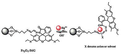毒性重金属离子检测及回收方面:利用汞离子能够诱导罗丹明内酰胺结构开环发出荧光特性,将罗丹明肼合物经化学反应修饰于 Fe3O4 微球表面。吸附汞离子后的Fe3O4-R6G,可使用外加磁场实现快速固液分离,使制备出的 Fe3O4-R6G具有检测与吸附去除双重功能,对汞离子最大吸附容量可达37.4 μmol/g(Journal of Hazardous Materials, 2013, 244: 621-627,专利申请号:201210396580.1)。