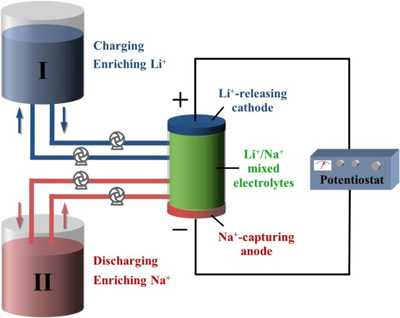 此外,该新型电池独特的工作方式还使其具有Li+/Na+分离的功能。通过构建如图2所示的简单反应体系,通过反复的充放电过程即可分别实现对Li+和Na+的富集,与现有的化学分离技术相比操作更为简便且更加绿色环保,因此该技术在海(或卤)水中Li+和Na+的大规模分离方面具有重要的应用前景。