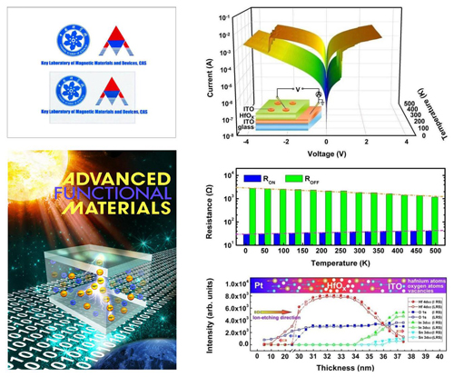 最近,该研究团队设计并制备了具有卓越存储性能的全透明氧化物存储器件。在不发生软击穿(forming-free)的情况下该透明器件具有明显的双极性电阻转变特性,高低阻态开关比为 ~ 45;具有良好的抗疲劳性;保持时间大于107s(推演得到连续操作10年后高低阻的比值衰减小于17.6%)。此外,该器件在近紫外-可见-近红外(200 nm ~ 2000 nm)波段范围内具有出色的透光性,并且在10 到490 K(即~ ±240 °C)的宽温区范围内都可以稳定地保持其存储性能,综合指标优于目前所报道的透明RRAM 器件,在未来透明电子产品上具有应用前景。进而,通过X射线光电子能谱深度分析(XPS Depth-Profiling)技术研究了起始态(IRS)和低阻态(LRS)下HfOx薄膜中不同深度处的氧/铪成分分布,发现在电场作用下,氧离子迁移以及金属铪富集所形成的导电丝的生长、断裂和再生是该器件阻变过程的物理机制。