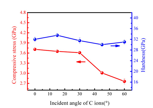 不同碳离子源入射角下薄膜残余压应力与硬度