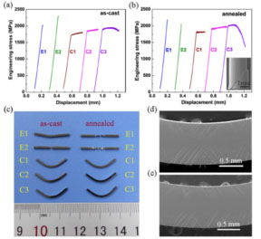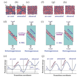 不同非晶合金退火前后的“脆者(E-型非晶)更脆,韧者(C-型非晶)恒韧”现象(左图),及其对应的剪切变形模型与解释(右图)