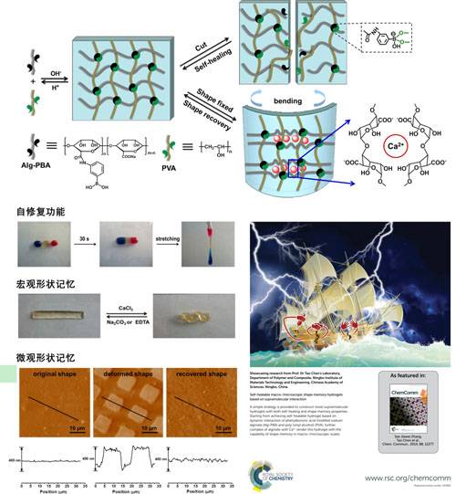 近年来,随着超分子科学的发展,具有特殊的可逆性和高度的动态性的超分子作用力,如金属配位作用、主-客体作用和动态共价键等在制备结构规整、性质可控功能材料方面表现出了显著的优势。中科院5630福彩网智能高分子团队将超分子作用引入形状记忆高分子材料,制备了基于超分子作用的形状记忆高分子材料。科研人员首先合成了含有苯硼酸侧基的海藻酸钠(Alg-PBA),利用苯硼酸和聚乙烯醇(PVA)羟基间的动态硼酸酯键,制备了具有自修复功能的水凝胶。然后借助于海藻酸钠和Ca2+之间的配位络合作用,得到在宏观和微观层面都具有形状记忆功能的水凝胶。这种水凝胶利用了双重超分子作用,成功实现了形状记忆和自修复两种功能的结合。相关研究工作发表在Chem. Commun. 2014, 50,12277 (IF = 6.718)上,并被选为当期的内封面文章。该研究团队最近发展了这一思路,利用硼酸酯键保持材料的临时形状,制备了pH和糖响应的形状记忆高分子材料,此工作不但得到了生物分子响应的形状记忆高分子材料,还大大缩短了材料的形状恢复时间。该研究成果发表在Maromol. Rapid Commun. (accepted)上。上述研究成果是对形状记忆高分子材料的有效补充及创新,为开发生物医用形状记忆高分子材料提供了新的思路。