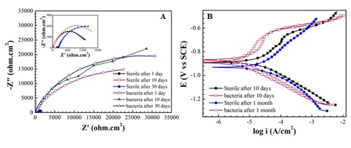 (B)为比较了在含菌海水和空白海水中浸泡10天和1个月 的A36钢的极化曲线