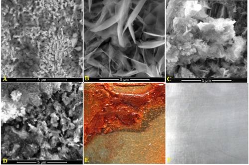 图(E)和图(F)分别为碳素钢浸泡在空白海水和含菌海水1个月后的外观形貌