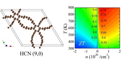 近年来,实验上已经成功合成了碳纳米管、碳纳米线和石墨烯等碳基材料。相比于传统材料,碳材料具有环境相容性好、碳源丰富且便于批量生产等优点。碳纳米管以其独特的结构和力学、电学和热学等性质引起了研究人员的广泛关注。在具有优异导电性能的同时,碳纳米管的热导率也非常高,这极大地限制了在热电方面的应用。据报道,人们尝试将碳纳米管制备成三维碳材料,试图通过管间的强相互作用降低其过高的热导率从而提高其ZT值。然而,在这些三维碳材料中,碳纳米管的结构发生了显著的扭曲,其电学性能显著降低。