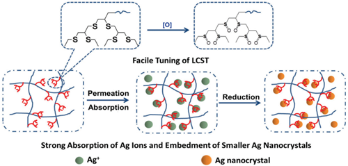 中科院5630福彩网乌学东研究团队通过使用含树枝状硫醚单体制备了高载银含量的水凝胶材料。每个树枝状硫醚单体含有六个硫醚键。硫醚键具有氧化响应性,能够在较弱地氧化剂 (如:双氧水、次氯酸钠等)作用下生成亚砜键,实现由憎水至强亲水的快速转变,而且硫醚键对重金属离子有较强的螯合能力,单体树枝状的“爪形”结构更利于加强螯合作用。将这种单体引入到温敏性的聚N-异丙基丙烯酰胺水凝胶中,可实现以下特点:通过设定不同的氧化程度,可以使水凝胶的低临界溶解温度 (LCST)可以在31.0~88.1 oC的范围内简易快速地调节;硫醚单体大幅提高了水凝胶的载银量,以硫醚或亚砜单体2.5 mol%含量的水凝胶为例,载银量可分别达到55.0 mg (Ag) / g (gel), 67.2 mg (Ag) / g (gel),比单纯的聚N-异丙基丙烯酰胺水凝胶分别高了19倍与23倍;经原位还原后,可得到均匀分散的粒径为10 nm左右的银粒子。基于这些特点,含树枝状硫醚单体的载银水凝胶可设定使用温度从而控制银离子释放速度。