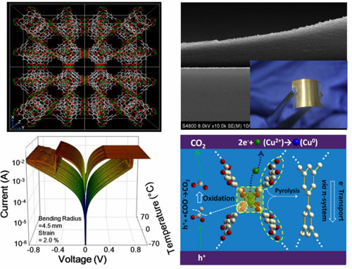 值得指出的是,微米尺度的RSMOF-1单晶目前尚无法制备成真正的存储器件,而且机械柔韧性也无法与薄膜材料相比。为解决上述问题,该团队利用改进的液相外延法在柔性Au/PET衬底上制备了纳米级高质量有机金属框架(HKUST-1)薄膜。研究发现,该MOF薄膜材料能够在±70℃的宽温区范围内保持均一的阻变特性,更为重要的是,在动态的弯折测试过程中,Au/HKUST-1/Au/PET器件可在0至2.8%的应变情况下仍能保持稳定可靠的存储性能,为探索柔性存储器件提供了新的材料体系。基于上述研究结果,申请中国发明专利1项(201510106614.2),论文近日作为内封面文章发表在Adv. Funct. Mater. DOI: 10.1002/adfm.201500449。
