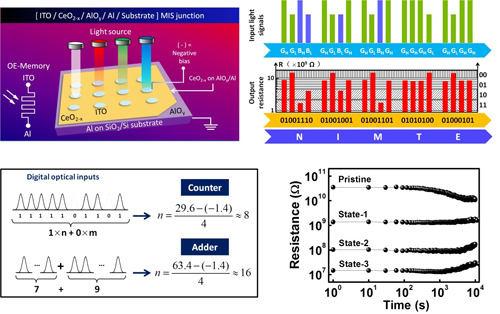 一般来说,光电信息互联芯片可以集成光源、控制器、滤波器、运算器、探测器和存储器等组件。将光路引入电路,能够共同完成信息的编码、传输、解码、运算、处理及存储过程,有望作为后摩尔时代信息处理与存储技术的替代方案。其中,主要组件包括独立的光信息存储器件(即通过光写入方式存储信息)和信息处理器件等。而多种功能集成的光电信息存储器能同时实现信息的处理并存储,从而可降低集成电路的复杂性,有望用于急剧增加的海量信息处理与存储。最近,该团队的檀洪伟同学和刘钢研究员等人利用光脉冲和电场对金属-半导体肖特基接触界面处缺陷态电子浓度的调控,获得了电场可擦除的可持续光电导效应;进一步研究发现该可持续光电导随光照时间呈线性关系,并且具有从可见到紫外的宽谱响应。基于此效应,他们设计了一种集光信息的编码/解码、运算及存储于一体的新型信息处理与存储器件。在该多功能器件中,可以分别利用光的颜色(频率)和强度对信息进行编码或解码,并利用对光脉冲个数的线性响应特性实现对光信号计数或者进行数值运算;基于可持续光响应效应,可对上述解码或者运算的结果进行多态信息存储,从而实现了对光信息实时获取、处理与存储过程,即在一个器件中实现了光电转换、数值运算、以及信息存储功能的集成。相关结果申请中国发明专利1项(201510114334.6),并被作为底封面论文发表在Advanced Materials DOI:10.1002/adma.201500039。