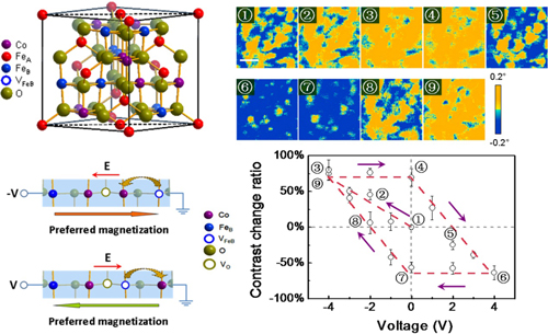 另一方面,磁存储一直是信息存储的主流技术。无论是传统的硬盘还是新兴的磁性随机存储器,通常都采用外加磁场或者电流的方式写入信息,非常不利于器件的小型化和低功耗的发展需求。因此,寻求通过电场在纳米尺度下对磁性进行有效调控的方法已经成为近十年来的一个研究热点。该团队的陈欣欣同学、朱小健同学、刘钢研究员等人与新加坡国立大学的丁军教授合作,基于离子型阻变随机存储技术,提出了在纳米尺度下通过电场诱导离子输运调控铁氧体薄膜材料磁化方向的新思路。通过第一性原理计算发现,具有铁缺陷的钴铁氧体材料(CoFe2-xO4)中的钴离子可以在电场作用下发生迁移并重排,从而诱导出单向磁各向异性。随后,他们利用扫描探针技术在纳米尺度上对CoFe2-xO4薄膜施加电压,并原位观测其微区磁畴的演变规律,证实外加电场能够使CoFe2-xO4薄膜的磁化方向发生非易失性的可逆翻转,在纳米尺度下实现了通过电场调控磁矩方向。这种实现电场调控磁性的方法无需低温环境以及磁场的辅助,为发展新型的信息存储技术以及电场调控的自旋电子器件提供了一种新途径。相关结果近日发表在ACS Nano DOI:10.1021/acsnano.5b00456上。