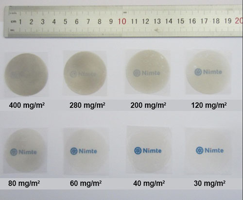 使用温和环境友好的合成方法,成功制备了不同长径比、分布均匀性好的银纳米线,并且可以固态形态放置,需要使用的时候,进行分散。进一步,以PET、PI和纤维素等高分子为基底,制备了高透过率、低电阻的二维及三维透明导电薄膜,展示出很好的抗弯曲性能。同时,该类薄膜可用于高性能的电加热领域,实现良好的除雾升温功能。而对于以纤维素为基底的薄膜,更具有环境友好和可降解的特点,可能是未来直接接触皮肤类可穿戴设备的选择。相关工作论文将发表在Materials letters等期刊上。