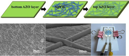 银纳米线薄膜具有优良的光电特性和柔韧性,但单纯的银纳米线薄膜的表面粗糙度较大及与基底的附着力差。本课题组采用磁控溅射和旋涂法、滚涂法相结合,在PET、PI的柔性基底上制备了金属氧化物/银纳米线/金属氧化物三明治结构复合薄膜,进一步增加了薄膜的抗弯曲性能和耐候性,该复合薄膜有望应用于柔性电子器件,能源存储和光伏器件等领域。相关工作发表论文:Journal of Materials Chemistry C, 2014, 2(19), 3750,ACS applied materials & interfaces, 2015, 7(7): 4299;专利:103730195A,103730194A。