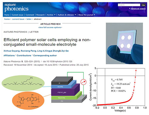 考虑到有机太阳电池的商业化应用对低成本大面积化的迫切需求,葛子义研究员领导的研究团队在前期大量研究工作的基础上,创新性的开发了一种制备工艺简单、价格低廉、可用醇类溶剂湿法加工的有机非共轭小分子作为有机太阳电池的阴极界面。团队成员欧阳新华、彭瑞祥等利用这类材料对有机太阳电池器件界面和结构进行优化,把单结正型聚合物太阳电池的光电转换效率提高至10.02%,突破了单结有机太阳电池10%的效率瓶颈,同目前广泛使用的金属界面相比,电池的光电转换效率提高了近25%,也明显优于有机共轭类界面材料。相关结果经过国家光伏质检中心的认证,是公开认证最高效率的单结有机太阳电池之一,得到了Nature Photonics审稿人的高度评价,认为该研究成果“对于聚合物太阳电池有非常重要的贡献”,这项成果有望促进有机太阳电池的低成本、大面积化制备,加快推进有机太阳电池的商业化进程。