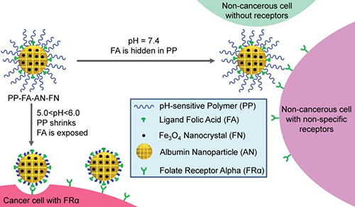 为提高SPION基MRI造影剂主动靶向肿瘤的性能,该团队的沈折玉副研究员指导高级研究助理马雪华,通过脱溶剂法合成了内部包裹有MRI造影剂SPION的白蛋白纳米球(AN),并在该纳米球表面偶联上靶分子叶酸(FA)。研究表明,该SPION-AN-FA复合纳米粒子具有良好的球形结构、粒径均一、并具有很好的水相分散性(多分散系数PDI<0.05)、无细胞毒性,具有主动靶向乳腺癌细胞(MCF-7)和肺癌细胞(SPC-A-1)的性能。由于其r2/r1比值(~40)远高于已上市同类产品Resovist®(~11),该SPION-AN-FA复合纳米粒子具有更强的MRI成像效果。相关研究结果发表在Colloids and Surfaces B: Biointerfaces 2015, 126, 44-49。