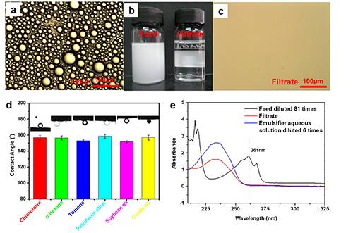 图(a)和(c)分别为油水分离前后的光学显微镜图,图(b)为油水乳液和过滤液的光学照片。