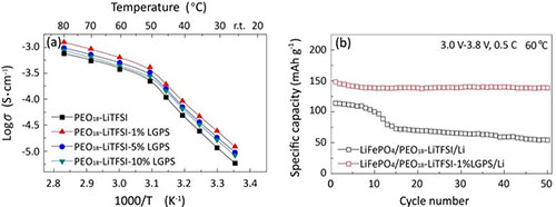 在无机-有机复合固体电解质研究方面,团队科研人员将超高锂离子电导率三元硫化物材料LGPS作为活性填料对PEO聚合物锂盐体系进行改性。研究结果表明,仅仅1%LGPS的添加就可以大幅度提高PEO电解质体系的锂离子电导率,图3(a),并有效拓宽电化学窗口和提高锂离子迁移数,同时具有比较好的对锂稳定性。由该电解质构建的全固态锂电池LiFePO4/PEO18-LiTFSI-1%LGPS/Li 在60 oC,0.5C条件下,循环50周后电池容量保持率达到92.5%,图3(b)。相关研究成果已发表在J. Power Sources (2016, 301, 47-53)。