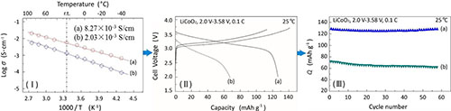 在三元硫化物固体电解质研究方面,团队科研人员通过分别制备Li10GeP2S12 (LGPS)和 Li3.25Ge0.25P0.75S4 两种三元硫化物电解质,其室温电导率分别为 8.27×10-3 S cm-1 和 2.03×10-3 S cm-1,图2(Ⅰ),用以系统研究锂离子电导率对固态电池性能的影响机制。尝试采用LiCoO2正极材料构建全固态锂电池,在室温0.1C条件下,高离子电导率能够显著提高正极材料的放电容量,图2(Ⅱ),但对电池的循环性能影响不明显,图2(Ⅲ),从而可以得出结论:固体电解质的离子电导率是固态电池能量密度的最重要影响因素。相关研究成果已发表在Solid State Ionics (2015, 274, 8-11),并对其成型技术申请了相关发明专利(CN201510009660.0)。