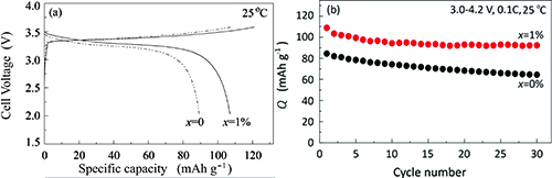 近年来,宁波工研院所属新能源技术所全固态锂电池研究团队,在高锂离子电导率二元系、三元系硫化物固体电解质以及有机-无机复合电解质方面取得了系列进展。在二元硫化物电解质研究方面,该团队科研人员以Li3PO4掺杂70Li2S·30P2S5 二元硫化物体系引入多种离子缺陷协同增强思路,发展了一种室温电导率达到1.87×10-3 S cm-1的固体电解质材料,图1(a)。由其构建的全固态电池In-Li/70Li2S·29P2S5·1Li3PO4 /LiCoO2首次放电容量提高到108 mAh·g-1,比未掺杂全固态电池In-Li/70Li2S·30P2S5 /LiCoO2的首次放电容量提高超过20%,图1(b)。相关研究成果在 J. Power Sources (2015, 284, 206-211) 发表。
