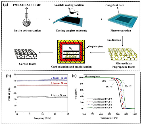 与石墨烯薄膜类似地,研究人员以先前采用非溶剂诱导相分离和热亚胺化相结合方法所制备出的聚酰亚胺(PI)/石墨烯复合微发泡薄膜材料为先驱体(相关工作发表在RSC Advances,2016,5:24342),利用高温碳化和石墨化的方法制备出了具有微孔结构的超薄碳膜(图3),其中石墨烯的存在可以稳定微孔结构并加速薄膜石墨化进程,微孔结构的存在可以增强电磁屏蔽效能,结果显示厚度仅为~24 μm样品的在X波段上屏蔽效能高达~24 dB,继续提升样品厚度至~73 μm可进一步提高屏蔽效能到~51dB,同时该超薄碳膜还具有极高的热稳定性(空气中分解温度高达550oC),相关工作发表在Carbon,2016,100:375。