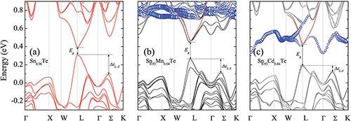 1)对于SnTe热电材料,通过理论研究阐释了几种典型掺杂对电热输运的调控作用,并实现了SnTe热电性能的显著提升。例如,理论研究表明本征Sn空位在SnTe能带调控中起着重要作用,Sn空位的存在使得Mg、Mn、Cd和Hg掺杂SnTe出现明显的带隙增大和轻/重价带能量差减小的特征(如图1所示),非常有利于SnTe热电性能改善。采用区熔法制备了Mn掺杂SnTe多晶样品,实验结果证实了以上的理论预测。Mn/Sn合金化可以实现带隙的增大和轻/重价带简并,SnMnTe的Seebeck系数可达270 μV/K,ZT值为1.25。相关研究结果发表于J. Mater. Chem. A, 3, 19974 (2015),RSC Adv., 5, 59379 (2015),RSC Adv., doi:10.1039/c6ra02658c(2016)和Phys. Chem. Chem. Phys., 18, 7141 (2016)。