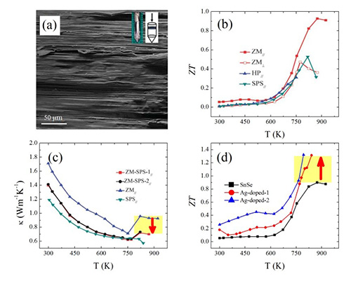 图2.(a)SnSe织构化多晶断面SEM图;(b)ZT值;(c)粉碎再烧结样品的热导率;(d)掺Ag样品的热电性能