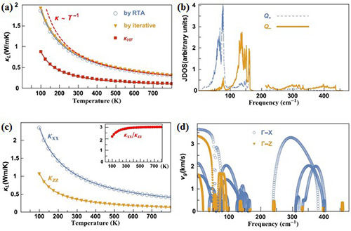 (c)xx与zz方向热导率及其比值;(d)沿Г-X与Г-Z方向声子群速度随频率分布