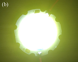 图5.(a)GGAG荧光陶瓷;(b)蓝光LED芯片激发发光