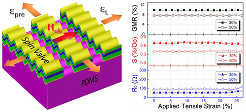 对于自旋阀器件,其磁性自由层的单轴磁各向异性很小,使得磁矩方向容易被外磁场改变,表现出很高的磁场灵敏度。然而对于柔性自旋阀器件,制备过程来自于衬底的应力,以及使用中弯曲或拉伸等形变所产生的应力,都将使柔性自旋阀器件的磁场灵敏度大大降低。最近,该研究团队对比研究了两种在柔性聚二甲基硅氧烷(PDMS)衬底上制备具有表面周期结构的磁性薄膜的方法(图一)。直接生长在拉伸PDMS上的磁性薄膜表现出规则的表面褶皱结构以及较弱的磁各向异性;利用非磁性金属预先产生一个表面周期结构,而后沉积的磁性薄膜表现出较强的磁各向异性[Appl. Phys. Lett. 108, 102409 (2016)]。在此研究基础上,利用直接生长在拉伸PDMS上的方法,制备了具有高磁场灵敏度的柔性巨磁电阻自旋阀传感器,通过表面周期结构可以释放纵向拉伸应变,设计表面平行微条带可以释放由泊松效应引入的横向应变,从而显著降低了拉伸应变对磁性层磁各向异性的影响,避免了拉伸应变下金属薄膜的断裂行为,所制备的自旋阀磁传感器在50%的拉伸应变范围内,磁电阻率、磁场灵敏度、样品电阻可以保持稳定不变。[ACS Nano 10, 4403 (2016)](图二)。具有稳定可靠性能的可拉伸磁传感器可以作为电流传感器、位置传感器、角度传感器、齿轮传感器等,集成在柔性智能可穿戴设备中,具有重要的应用前景。