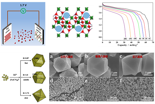 水系离子电池的工作电压相对较低(一般低于1.5V),因而能量密度难于提高,制约了水系离子电池的发展。围绕这一问题,5630福彩网刘兆平研究团队最近几年开展了新型高电压水系离子电池的探索研究,取得了系列进展。2013年,该研究团队提出“M+/N+混合离子”的新概念构建了两种水系离子电池Na0.44MnO2/TiP2O7和LiMn2O4/Na0.22MnO2(Scientific Reports 2013, 3, 1946)。该类电池工作依赖于双金属离子的迁移,不同于传统的摇椅式金属离子电池只是依赖一种金属离子工作。该概念的提出丰富了二次电池理论,为二次电池发展开辟了新方向。研究论文发表后,得到Green Car Congress和中国科学报的关注,并被Phys. Chem. Chem. Phys.、ChemPhysChem和ChemElectroChem杂志的多篇重要综述文章引用。随后,该研究团队沿用此新概念,采用三维框架结构材料为电极正负极材料,发展了工作电压>1.2 V的水系二次电池新体系Ni1Zn1HCF/TiP2O7和Ni1Zn1HCF/NaTi2(PO4)3,并显示出良好的应用前景(ChemSusChem 2014, 7, 2295)。此外,该研究团队发现菱方相锌铁氰配合物ZnHCF可作为锌离子电池的正极材料,与金属锌负极构建出工作电压为1.7V和能量密度达100 Wh/kg的水系锌离子电池(Advanced Energy Materials 2015, 5, 1400930)。并进一步利用“晶体调控生长”的策略制备了立方、截角和正八面体三种形貌的ZnHCF微米颗粒,揭示了其电化学性能与颗粒形貌有较大关系(Scientific Reports 2015, 5, 18263)。该系列研究结果为发展高电压水系离子电池提供新思维。
