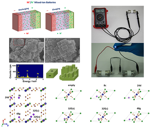 最近,该研究团队采用新型普鲁士蓝化合物InHCF为正极、磷酸钛钠NaTi2(PO4)3和焦磷酸钛TiP2O7为负极、混合碱金属离子水溶液为电解质构建出一系列高电压水系电池。其中,InHCF/NaTi2(PO4)3电池工作电压达1.6 V,能量密度为56 Wh/kg,功率密度超2700 W/kg。为了揭示InHCF中水调控碱金属离子嵌入机制,陈亮博士和邵和助博士联合深入进行了理论计算与模拟,发现对于锂/钠离子,水分子可提高其嵌/脱电位并降低其嵌脱反应的动力学,对于钾离子,水分子则不参加嵌脱反应。该研究工作最近发表在Nature Communications 2016, 7, 11982,得到了审稿人的高度评价。该研究工作既对设计高比能电极材料和理解离子嵌入型电极材料的储能机制具有重要理论意义,又对建立实用型水系离子电池奠定了科学基础。
