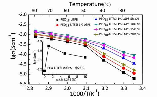 团队科研人员首次将具有超高锂离子电导率的三元硫化物Li10GeP2S12 (LGPS)与聚氧化乙烯(PEO)锂盐体系进行复合,制备得到固体薄膜电解质材料。该电解质柔性可弯曲且膜厚可调,其室温电导率达到1.18×10−5Scm−1,比传统的PEO基电解质提高1个数量级,电化学窗口达到5.7V,大大拓宽正极材料的选择范围,同时展现出比较好的对金属锂稳定性。由该电解质构建的全固态锂电池LiFePO4/Li 在60oC,0.5C条件下,循环50周后电池容量保持率高达92.5%(图1)。在此基础上,科研人员采用琥珀腈对该电解质进一步进行性能优化,改性后,其材料的室温锂离子电导率提高至~10−4Scm−1 (图2),使得由其构建的全固态锂电池LiFePO4/Li在40oC条件下就能实现正常充放电工作,而文献报道的该体系电池常规工作温度为80oC。
