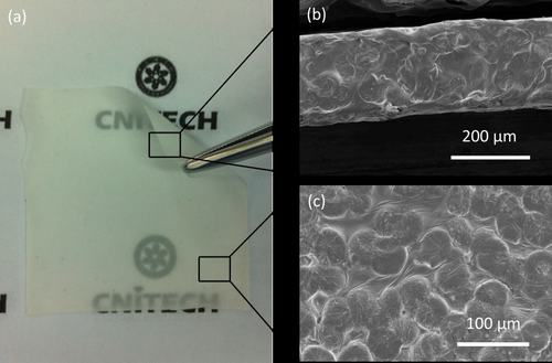 图3 固体薄膜电解质形貌及电镜照片(PEO-20%LAGP体系)