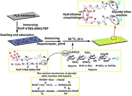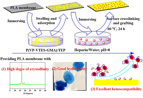 图1界面交联诱导聚乳酸微孔膜结晶及肝素化机理