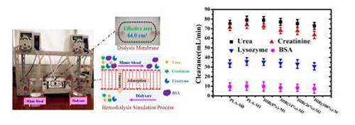 聚乳酸特别是薄壁(如透析膜壁厚40微米)中空纤维膜对耐热具有更高要求,然后在快速溶液相转化过程中,难以实现结晶度提高。针对此问题,我们发展了一种界面交联诱导结晶技术解决了聚乳酸微孔膜的结晶及耐热瓶颈问题。具体在聚乳酸微孔膜表面通过基于硅烷偶联剂的嵌段共聚物PVP-VTES预聚物的界面交联聚合,诱导聚乳酸发生结晶,结晶度可提高到35%,从而将耐热温度提高到100度,大大提高其尺寸及微结构稳定性,解决了其干燥及灭菌问题,界面诱导机理及耐热结果如图2所示。相关工作发表在RSC Advances 2016, 6, 20492-20499。为了进一步调控聚乳酸微孔膜的表面微孔结构,提高其表面微孔分布均一性及尺寸,课题组通过β环糊精生物基致孔剂结合界面交联,制备了具有超亲水特性的聚乳酸超微滤膜,表面微孔成均匀圆形分布,相关工作发表在Journal of Membrane Science 2016, 513, 166-176。界面交联可以在预聚物合成时引入具有反应性的环氧官能团如GMA,从而将三组分共聚物通过硅化学的界面吸附溶胀交联固定在膜表面,进一步的通过共价键合将肝素负载在膜表面,从而同步提高了膜的亲水性、耐热性以及血液相容性,表面肝素化是提高血液相容性的主要因素。该工作发表在ACS biomaterials science & engineering(DOI: 10.1021/acsbiomaterials.6b00413),如图1所示。除了表面肝素化相容性改善,我们制备了一种天然生物分子水蛭素,并通过氢键结合方式将其固定在经过界面交联改性的聚乳酸微孔膜表面,从而不改变水蛭素分子的抗凝活性,通过系统的凝血四项(APTT、PT、TT、FIB)、血小板黏附以及补体激活特性综合分析,提高了聚乳酸微孔膜的血液相容性,具有良好的透析性能,模拟透析实验(模拟血液和透析液的流量分别设定为100 mL/min、300 mL/min)表明其对小分子(尿素,79 mL/min;肌酐,74 mL/min)以及中分子(溶菌酶,34 mL/min)有害物质具有相对较高的清除率。相关工作发表在Journal of Membrane Science(http://dx.doi.org/10.1016/j.memsci.2016.10.027),如图2和3所示。