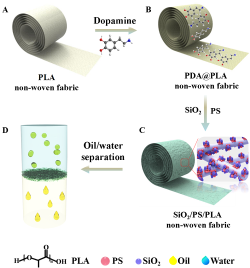 近日,5630福彩网智能高分子材料团队以生物相容性较好、可降解的生物基高分子材料聚乳酸(PLA)无纺布为主要原料,制备出具有特殊浸润性的生物可降解的环境友好型油水分离材料。研究人员利用聚多巴胺作为材料表面处理的“功能涂层”,实现对聚乳酸无纺布中纤维表面进行简单有效的修饰,进而利用聚多巴胺含有的羟基、亚胺基等官能团作为进一步功能化的“桥梁”,将纳米级的二氧化硅粒子(SiO2)和微米级的聚苯乙烯微球负载到聚乳酸纤维表面,从而巧妙的构建一种具有微纳米多级组装结构的聚乳酸无纺布复合材料(图 1)。