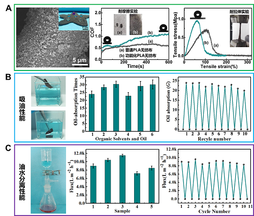 图 2.(A)超疏水功能化聚乳酸无纺布的微观结构及其耐摩擦和耐拉伸性能;聚乳酸无纺布的吸油性能(B)和油水分离性能(C)。