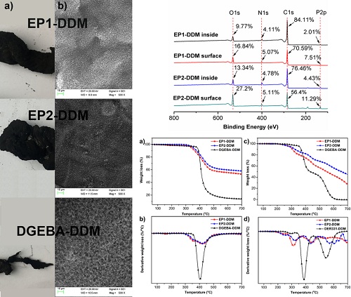 图2 香草醛基高性能阻燃环氧的成炭能力及炭层成分分析