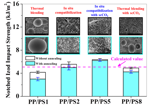 反应挤出原位生成界面相容剂是改善不相容体系相容性的一种有效手段。科研人员通过超临界二氧化碳作为反应介质,可以显著促进界面相容剂的生成,从而更有利于界面增容(图2)。相比于现有加工方法(熔融共混、以超临界二氧化碳为介质的熔融共混、原位增容),通过新方法(以超临界二氧化碳为介质的原位增容)制备的聚丙烯/聚苯乙烯(PP/PS)复合材料具有更好的分散形态、更强的界面结合力和更好的力学性能。(专利申请号: 201510560530.6; J. Supercrit. Fluids, 2016, 118: 203-209)