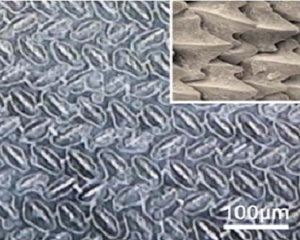 在薛群基院士承担的国家自然科学基金重点项目“海洋航体表面设计与仿生减阻机理(51335010)” 支持下,中国科学院海洋新材料与应用技术重点实验室与固体润滑国家重点实验室合作,在表面微结构、表面能对水阻的影响机制方面进行了系统的研究。利用3D打印技术获得了具有仿鲨鱼皮结构的平板试样,通过计算模拟、流场分析和微型水洞实验测试,发现水流在鲨鱼皮微结构中会形成微涡流;当微结构的宽度和深宽比达到一定值时,产生的微涡流能有效降低水流的摩擦阻力。根据理论和实验数据,提出了微涡流减阻机理;基于微涡流减阻机理,设计了具有微孔结构的亲水涂层,实现了10%左右的减阻效果(http://dx.doi.org/10.1016/j.surfcoat.2017.03.048)。另外,受海洋生物表皮粘液减阻的启发,实验室利用电沉积(ACS Appl. Mater. Interfaces, 2014, 6 (2) pp 1053–1060)和水热法,在网状金属表面制备亲油疏水微纳织构,并通过织构对半固态石蜡进行储存,获得的类粘液覆盖表层,其减阻效果可达到30%以上。(Scientific Reports 7, Article number: 40038 (2017) doi:10.1038/srep40038)