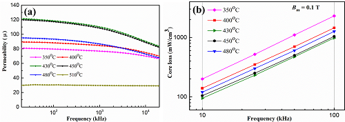 铁基非晶磁粉芯的(a)磁导率和(b)损耗随热处理温度的变化规律
