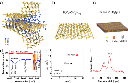 图1. a) 硅氧烯剥离过程示意图,b) 硅氧烯分子结构示意图,c) 碳包覆二维纳米硅/二氧化硅复合纳米负极材料的微结构示意图