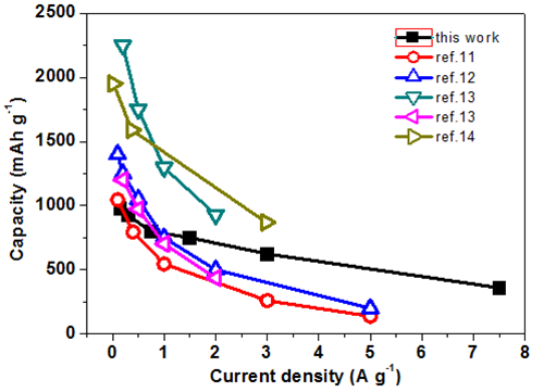 图2. 本研究工作的二维纳米硅/二氧化硅复合负极材料与文献报道的硅基负极材料的高倍率性能对比图